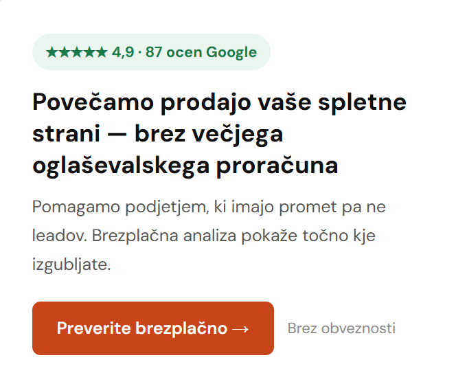 Podjetja vlagajo mesece v optimizacijo oglasov — boljše slike, boljši teksti — in zanemarijo stran, na katero vodijo. Dober oglas + slaba stran = porabljen proračun. Stran je tista, ki konvertira. Oglas je samo privabi.
