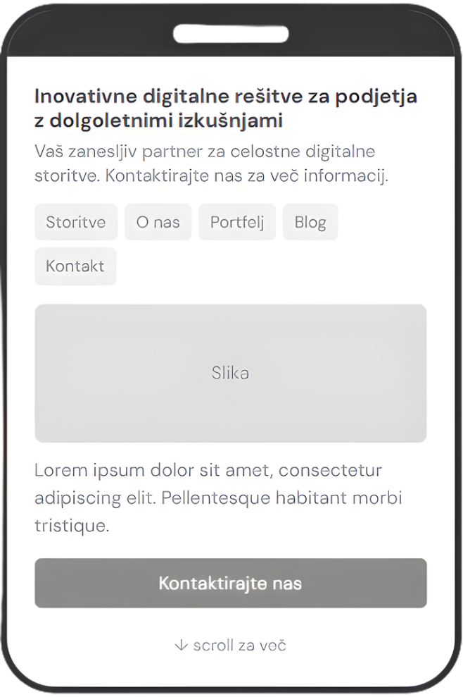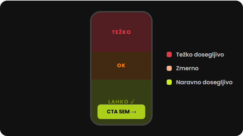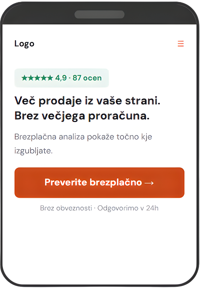 Na zaslonu 1366×768 mora biti CTA button viden brez scrollanja. Dodaj 2–3 besede pod button: “Brez pogodbe · Odgovor v 24h · Brezplačno”. Te besede zmanjšajo zaznano tveganje.
